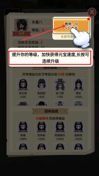 2、通过消耗资源提升等级,利用【长按可连续升级】功能,加快获取元宝速度。