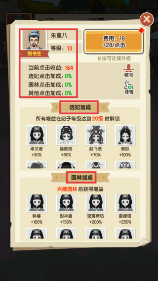 3、关注【选妃加成】和【园林加成】,达成对应条件解锁增益,提升点击收益。