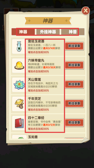 4、积极完成任务解锁【神器】,如【宫廷玉液酒】等,大幅增加点击加成。
