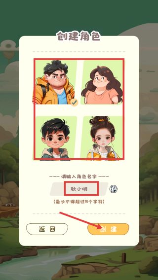 1、创建角色时,从四个形象中选择心仪的,输入不超5字符的名字,如【缺小明】,点击【创建】开启游戏之旅。