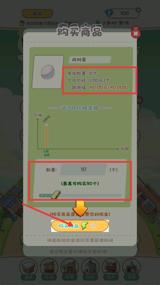 4、购买商品时,留意【库存数量】和【今日价格】,按需求填【数量】(不超50个),点击【购买商品】囤货盈利。