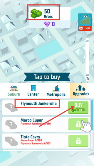 1、积累资金达50后,点击【BUY】购买【FlymouthJunkerolla】,开启资产积累,关注每秒收益增长。