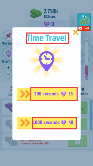 3、利用【TimeTravel】功能,花费钻石换取时间加速,如用15钻石换300秒,加快游戏进程。