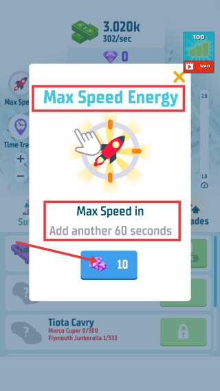 4、使用【MaxSpeedEnergy】,花费10钻石增加60秒极速状态,短期内提升收益效率。