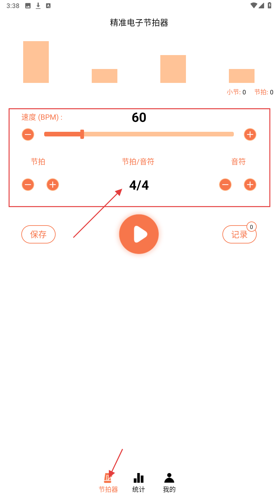 1、在【精准电子节拍器】页面,可调整速度(BPM)、节拍、节拍/音符(如4/4、4/2)等参数。