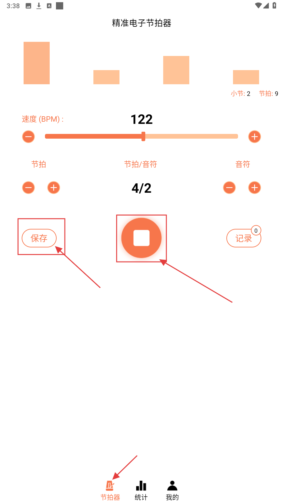 2、点击播放键启动节拍器,播放后,点击【保存】。