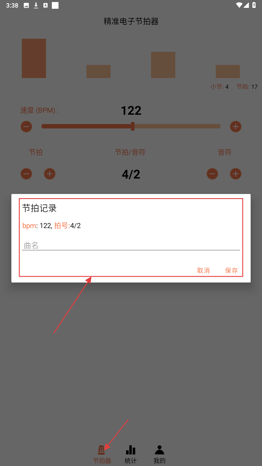 3、在弹出的【节拍记录】框中,可填写曲名,再点【保存】记录节拍设置。