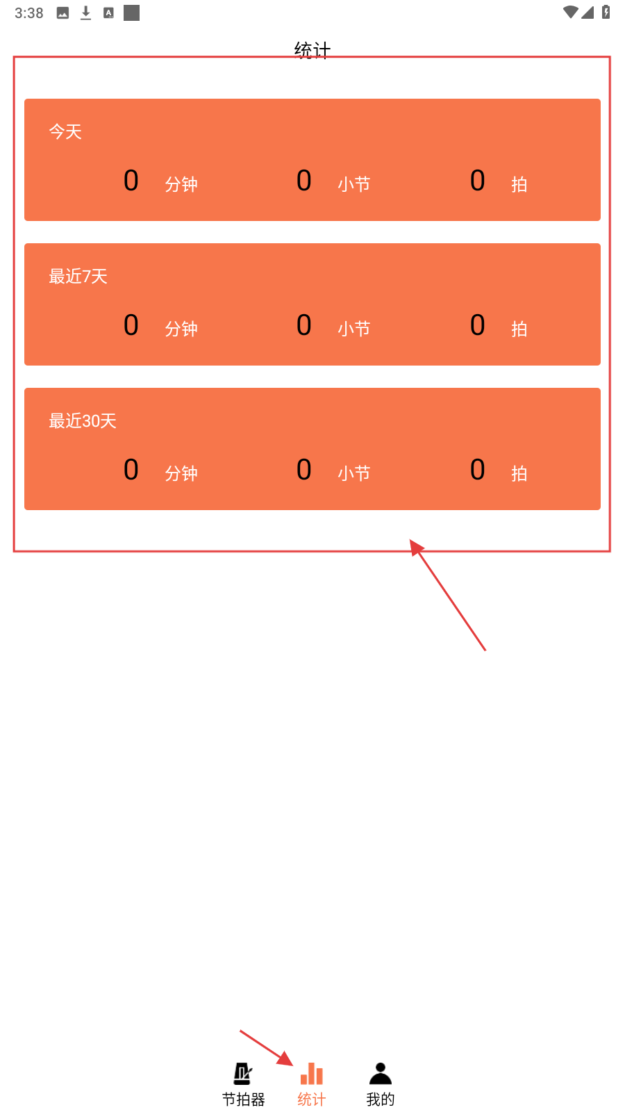 4、点击底部【统计】,进入统计页,可查看今天、最近7天、最近30天的使用时长(分钟)、小节数、拍数统计数据。
