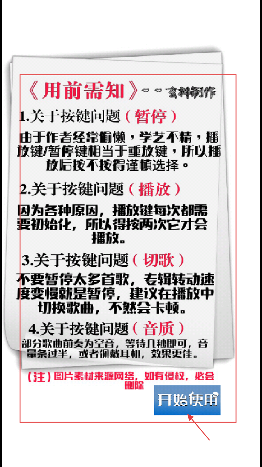 1、打开APP后,进入【用前需知】页面,该页面详细说明了【播放】【暂停】等按键的使用问题,阅读完毕后点击【开始使用】按钮。