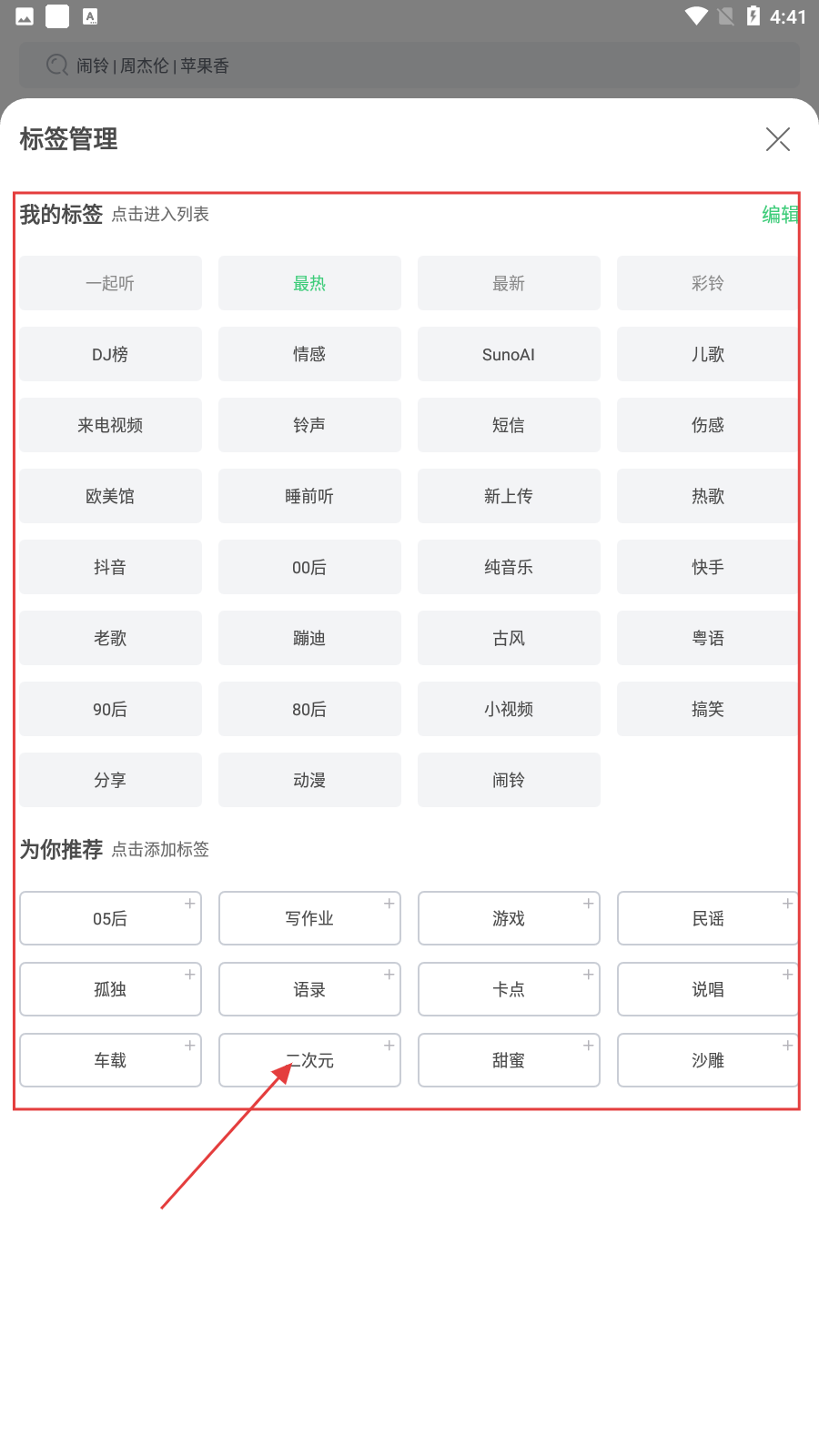 2、点击分类标签右侧菜单按钮,进入【标签管理】,有【我的标签】(含【一起听】等)和【为你推荐】板块,可按需选择。