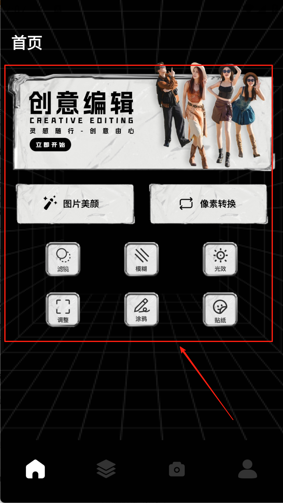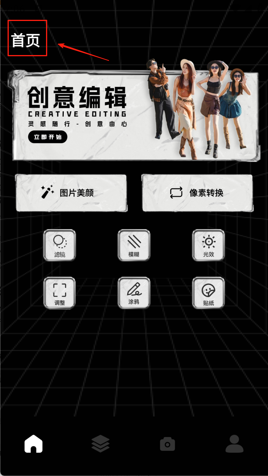 1、首页点"导入图片"选择相册或拍摄,红点标注新上线AI修图,收藏功能标记常用滤镜,裁剪工具支持自由比例哦。