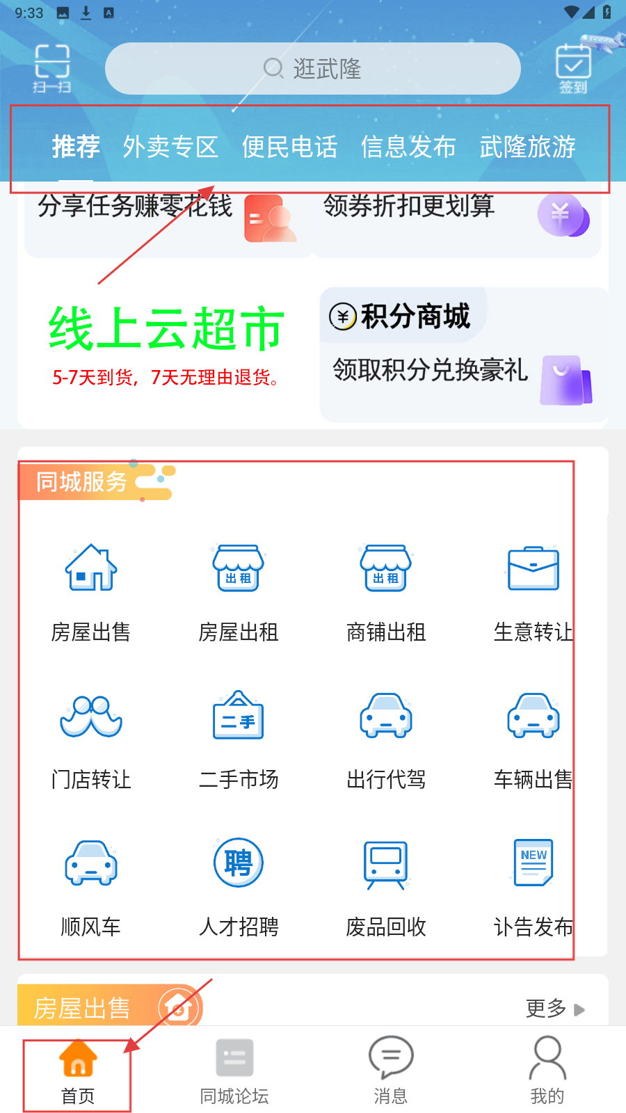1、打开APP,进入【首页】,这里有搜索栏、分类标签、【线上云超市】【积分商城】等板块,还有房屋出售、出行代驾等同城服务功能。