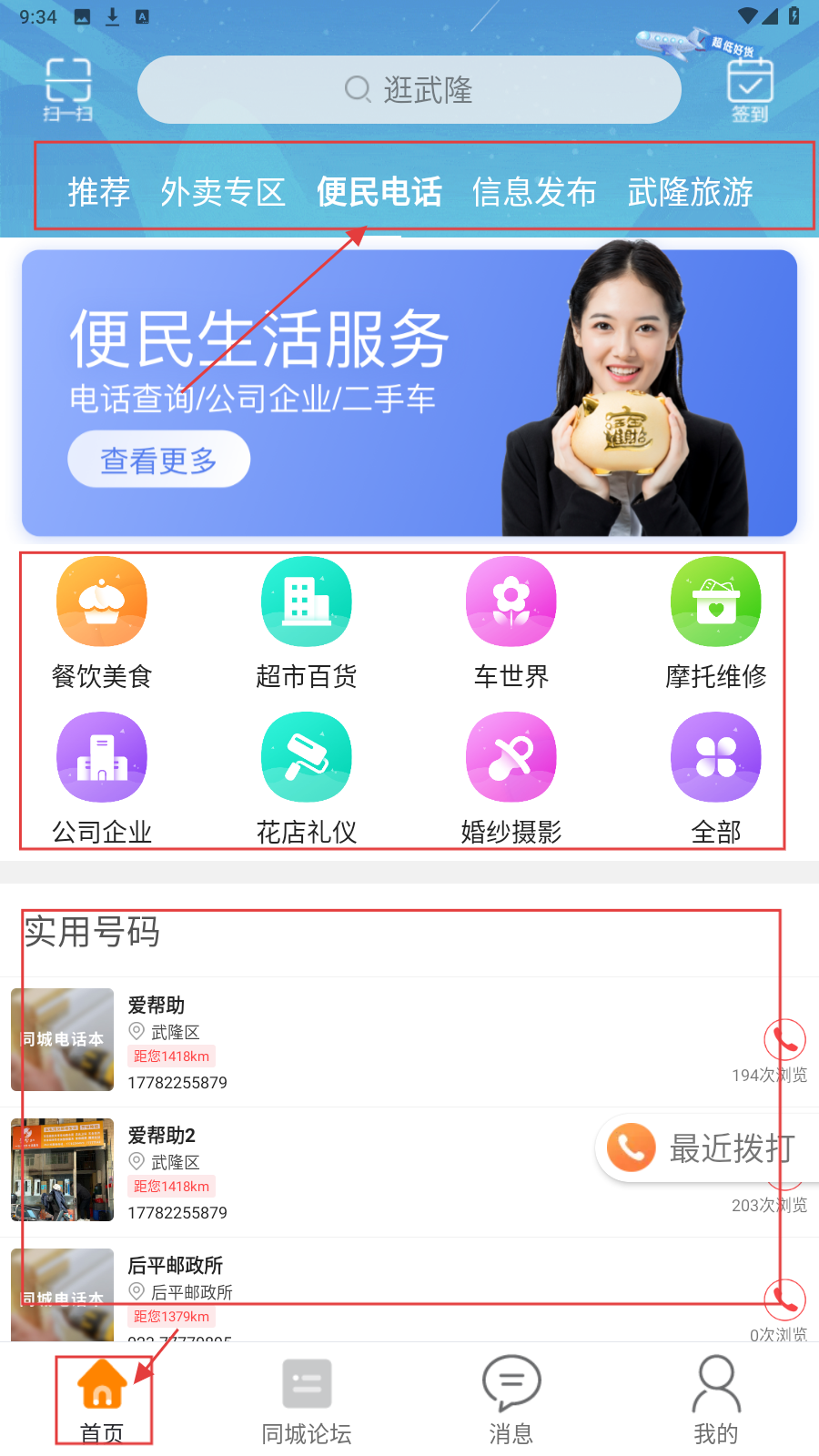 2、在首页点击【便民电话】,进入便民生活服务页面,这里有餐饮美食等分类,还有实用号码查询,可查找武隆区电话。