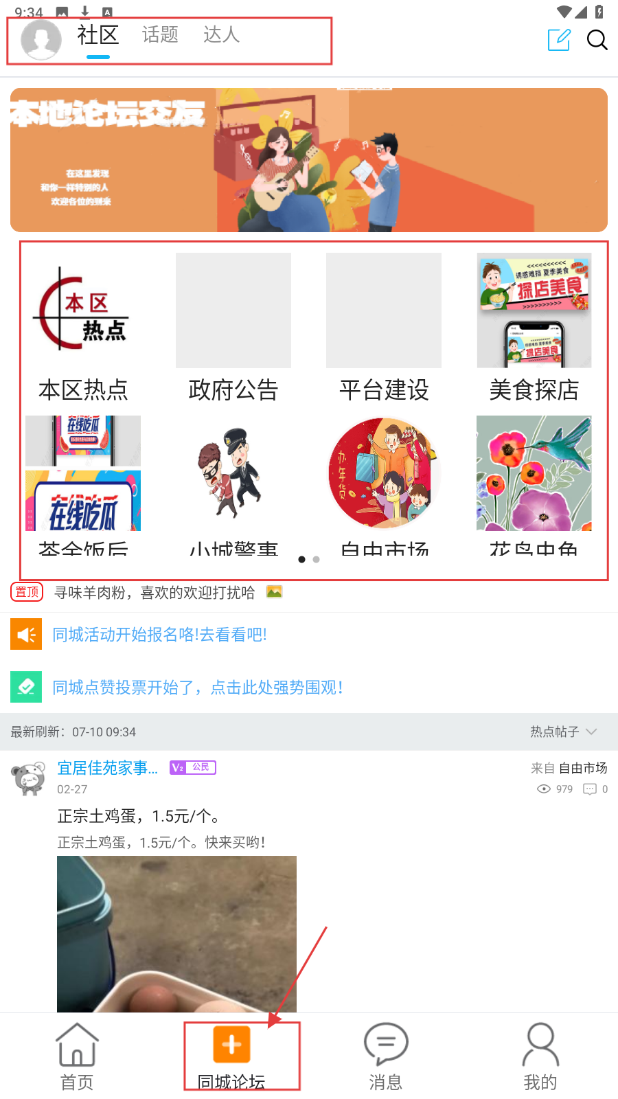 3、点击底部【同城论坛】,进入社区页面,这里有【本区热点】等板块,可浏览本地话题和活动信息,参与同城活动报名和点赞投票。