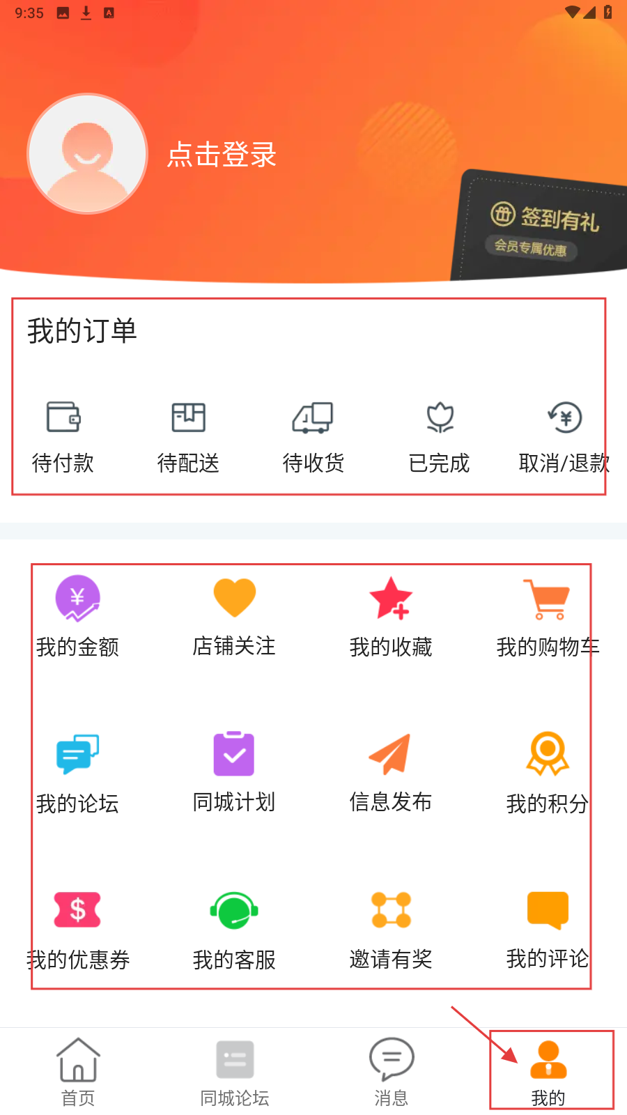 4、点击底部【我的】,进入个人中心页面,这里有【我的订单】板块,可查看订单状态,还有我的金额、店铺关注等个人功能选项。