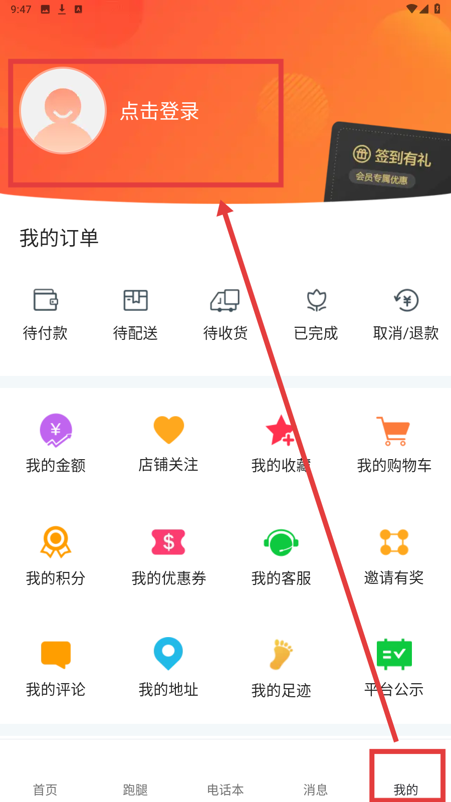 1、打开APP,进入【我的】页面,这里有【我的订单】板块,可查看待付款、待配送等订单状态等个人功能选项,点击【点击登录】。