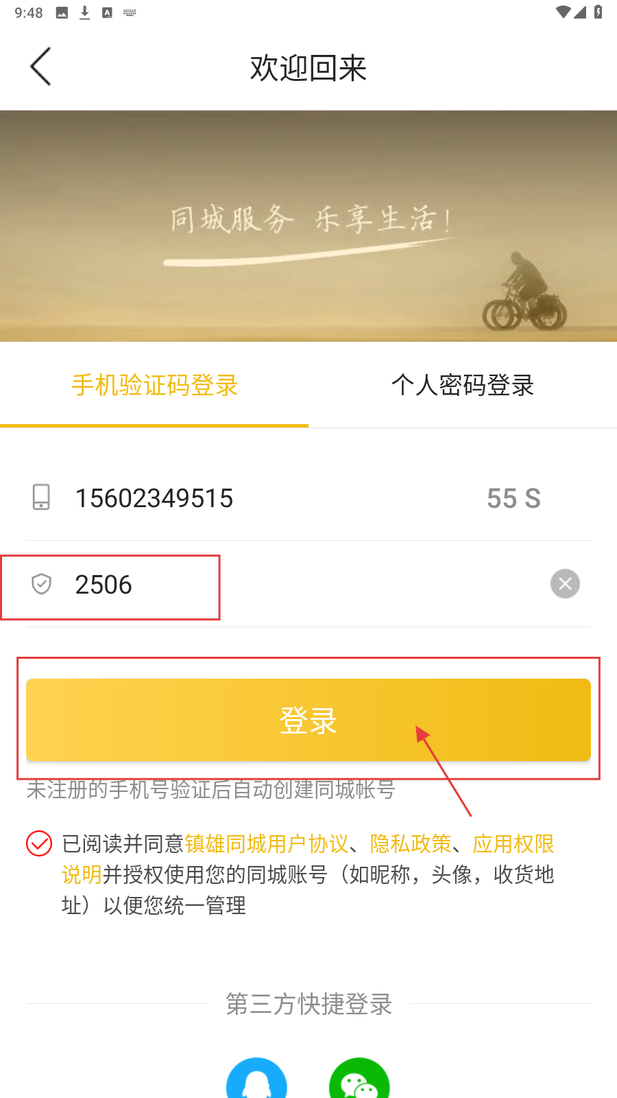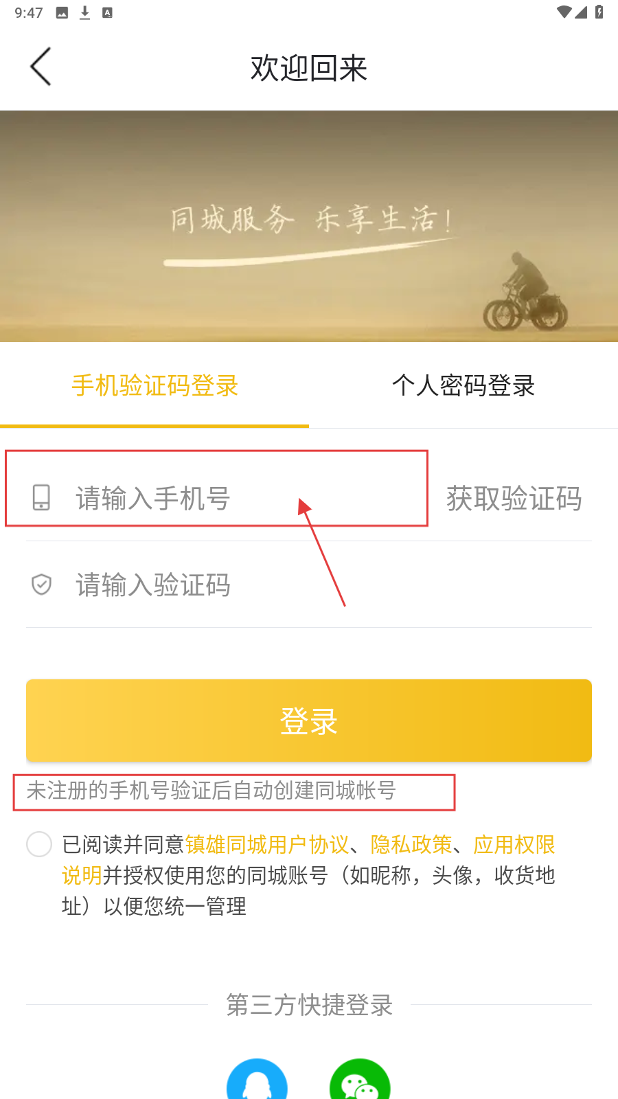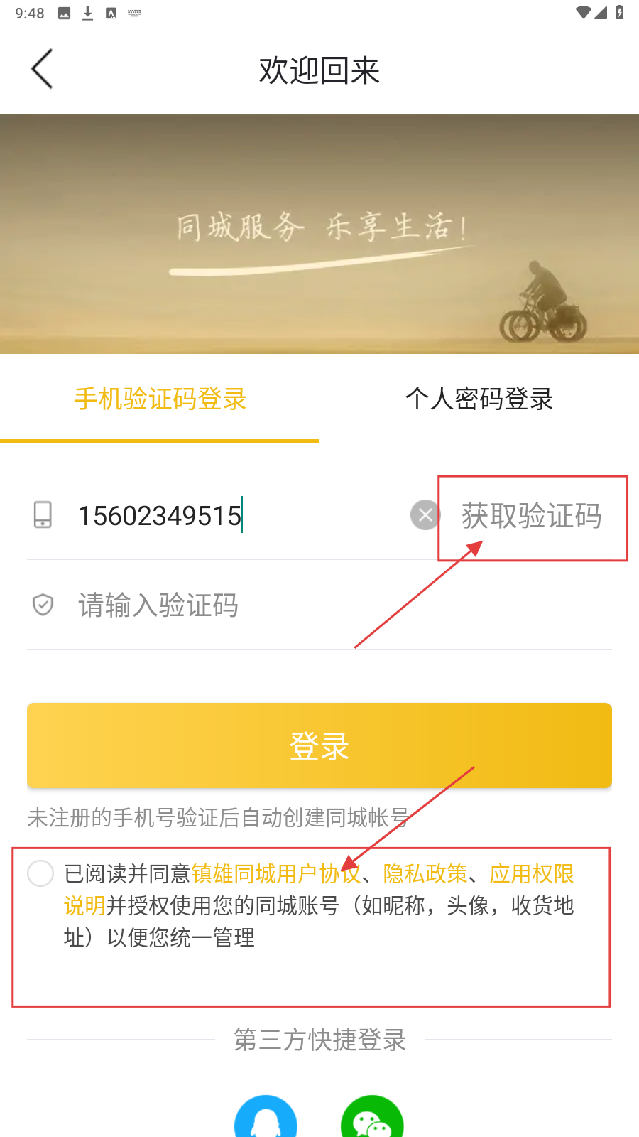 3、输入手机号后,点击【获取验证码】,等待接收验证码,同时勾选【已阅读并同意镇雄同城用户协议】。