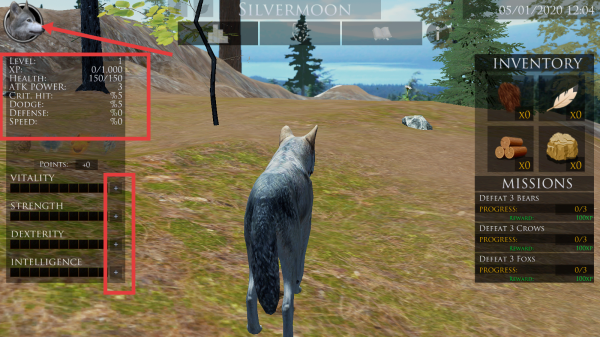 4、查看屏幕信息了解【LEVEL】【XP】等属性,完成【MISSIONS】获取奖励并分配点数提升能力。