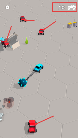2、操控蓝色车辆,利用连接的刺球撞击并摧毁红色车辆,留意屏幕上方的车辆剩余数量。