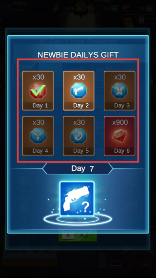 1、每日登录游戏,领取【NEWBIEDAILYSGIFT】中的对应奖励,积累资源。