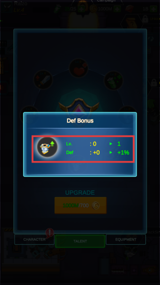 2、在【DefBonus】界面,消耗资源将防御属性从Lv.0升级到Lv.1,提升防御加成。