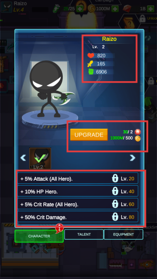 3、查看角色【Raizo】属性,满足条件时点击【UPGRADE】升级,解锁对应等级属性加成。