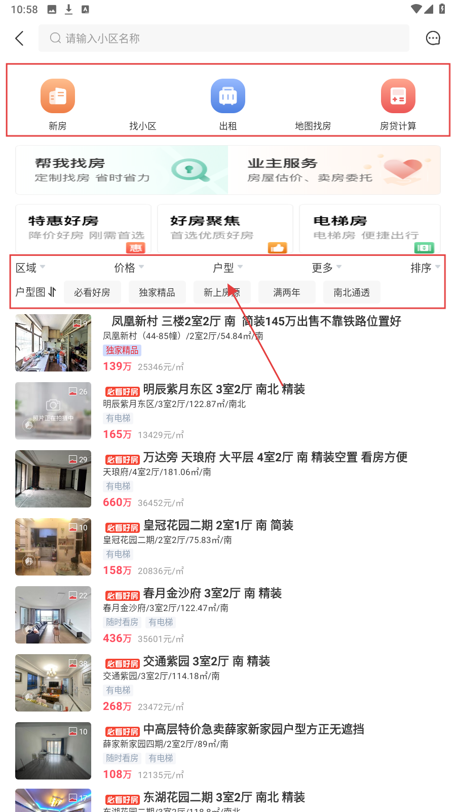2、点击【出售】,进入房源列表页面,有【新房】【找小区】等功能按钮,可根据区域、价格等条件筛选房源。