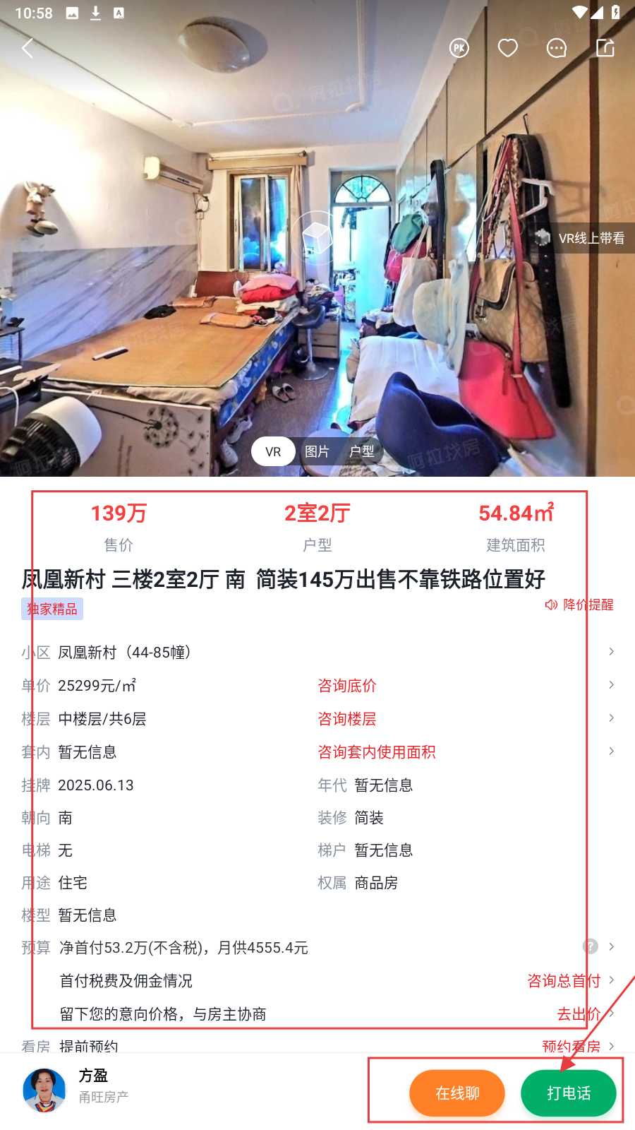 3、点击感兴趣的房源,进入详情页面,显示售价、户型等信息,可VR看房、预约看房或联系经纪人。