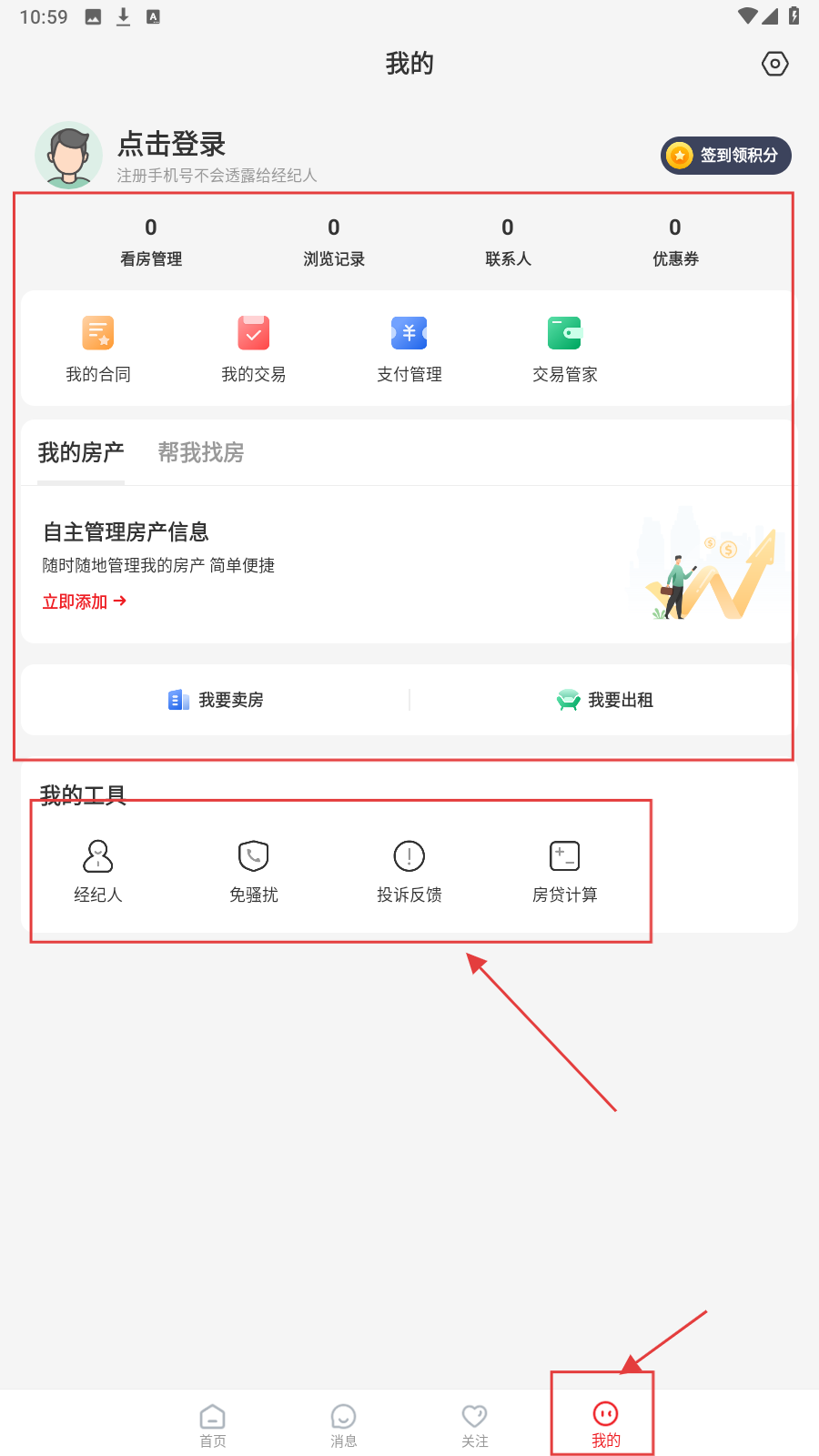4、点击底部【我的】,进入个人中心,有【看房管理】等功能选项,可管理房产信息,使用经纪人、免骚扰等工具。