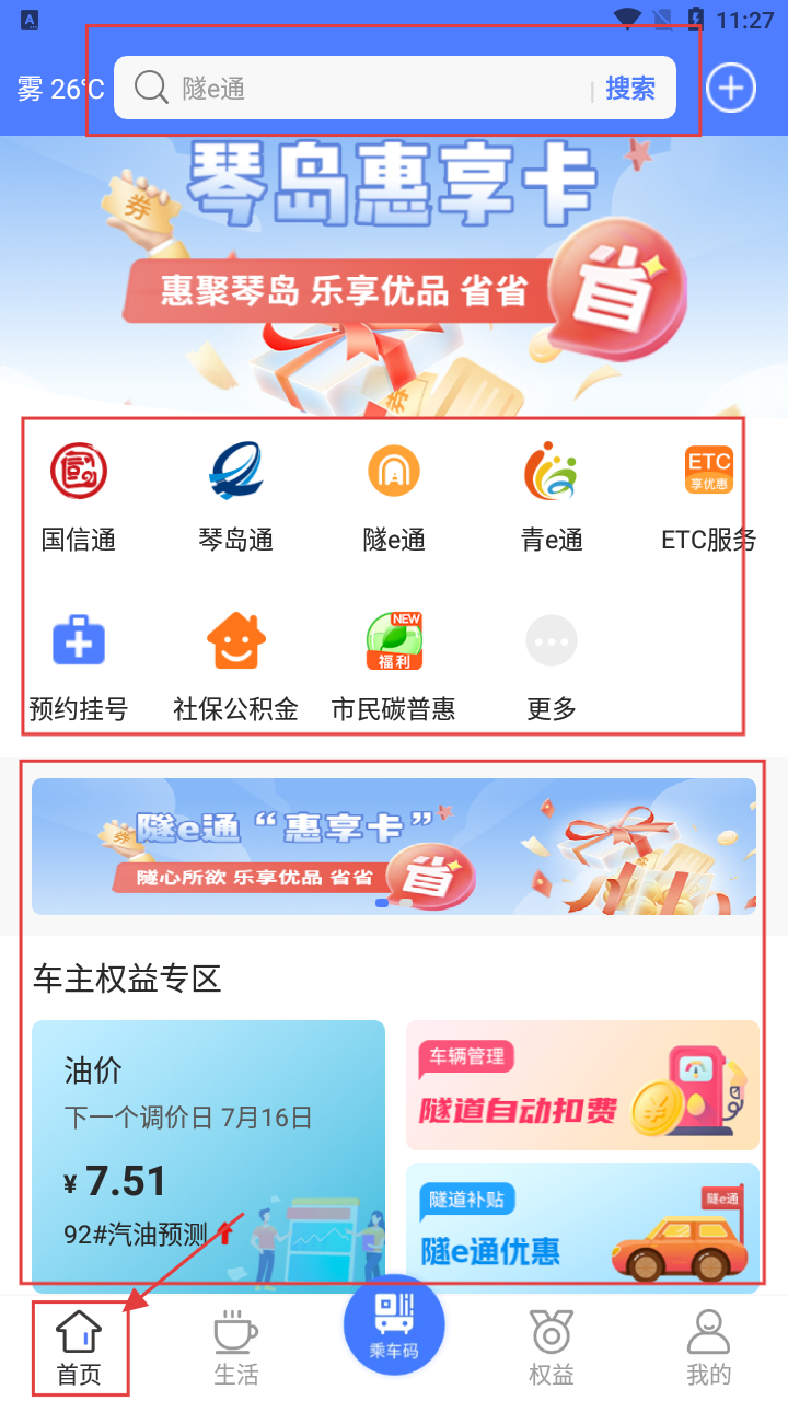 1、打开APP,进入【首页】,这里有搜索栏、【国信通】【琴岛通】等功能按钮,还有【车主权益专区】,可查看油价等信息。
