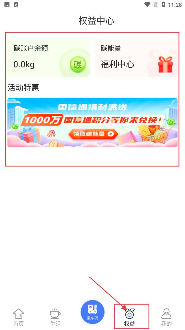 2、点击底部【权益】,进入权益中心页面,这里显示碳账户余额和碳能量等信息,还有活动特惠板块,可参与国信通福利派送等活动。