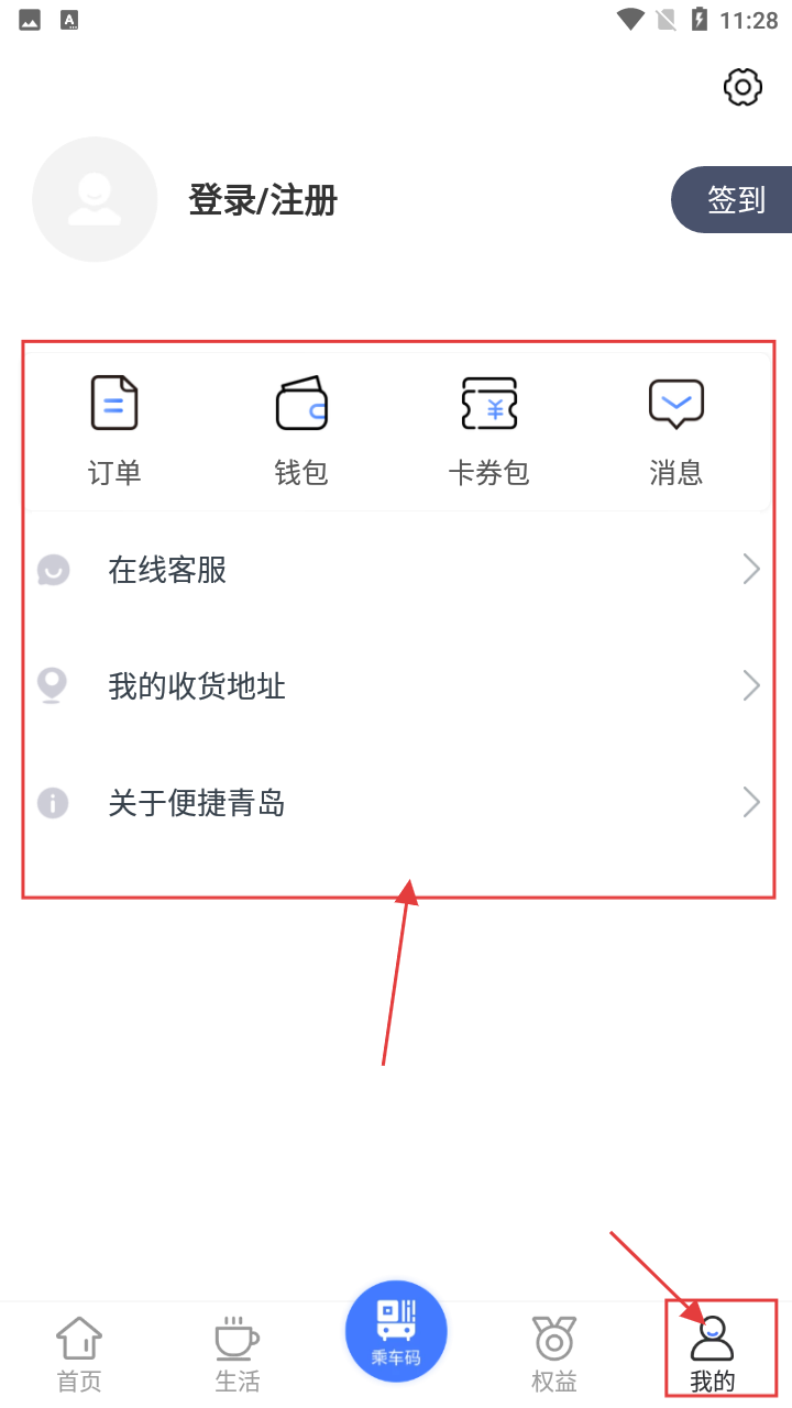 3、点击底部【我的】,进入个人中心页面,这里有【订单】【钱包】等个人功能选项,点击【登录/注册】。