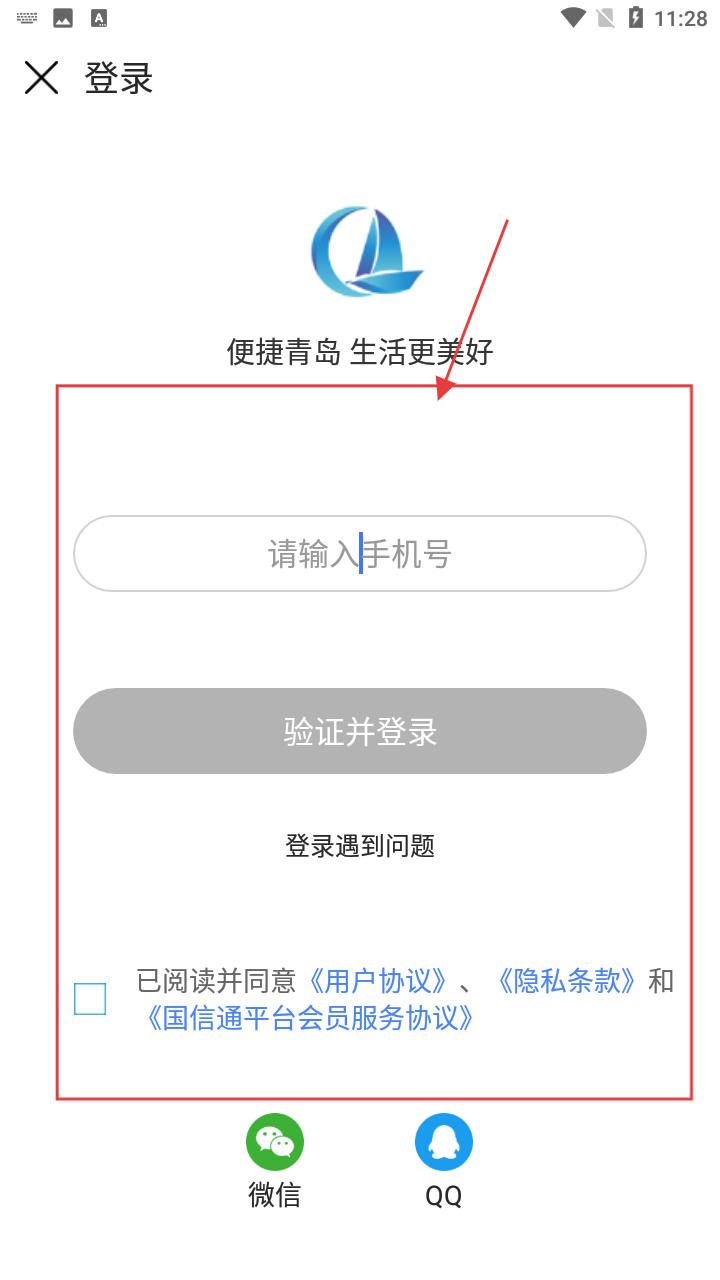 4、进入登录页面,在输入框中输入手机号码,勾选协议,点击【验证并登录】,或选择微信、QQ登录。