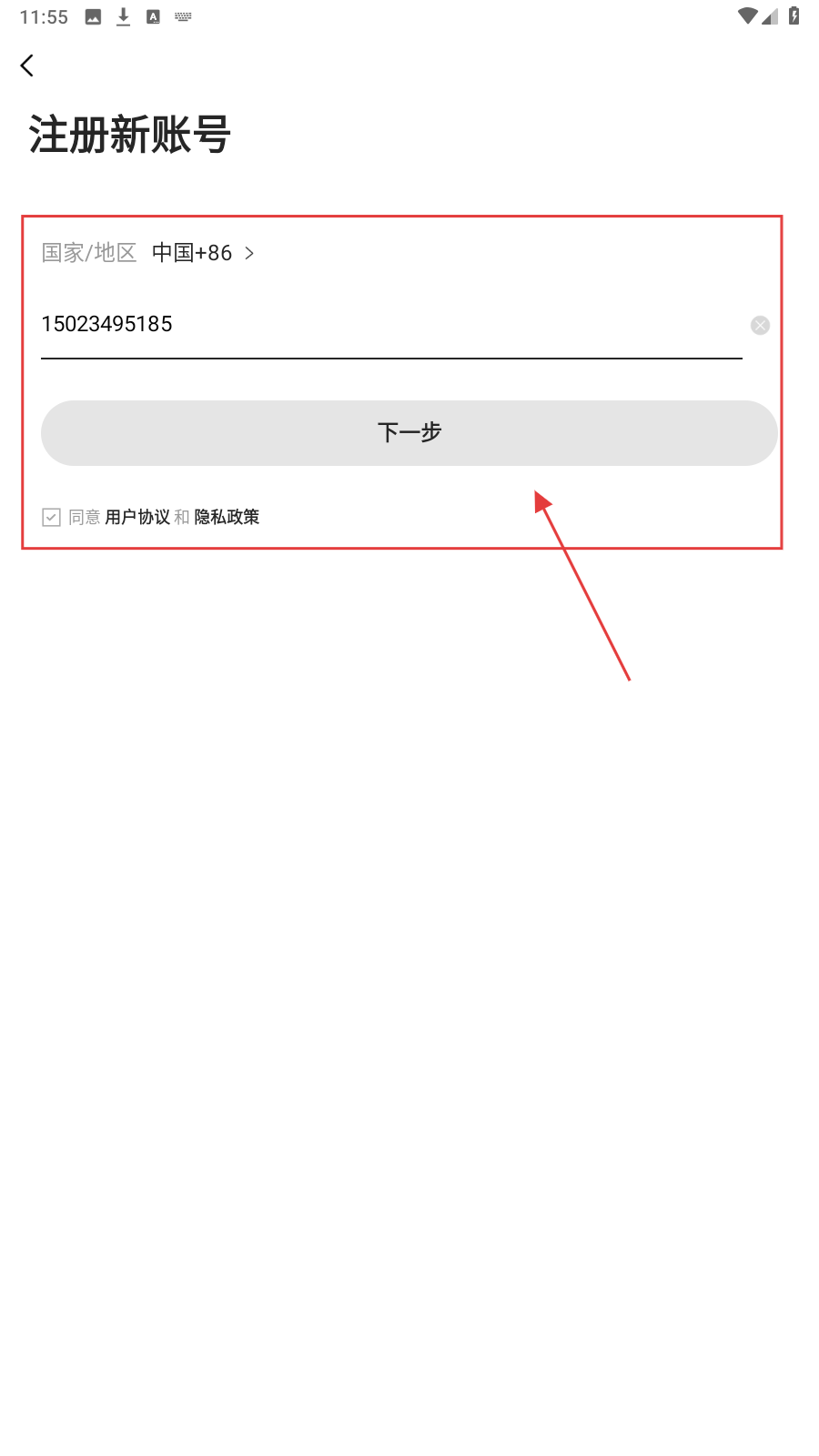 3、在输入框中输入手机号码,勾选【同意用户协议和隐私政策】,点击【下一步】。
