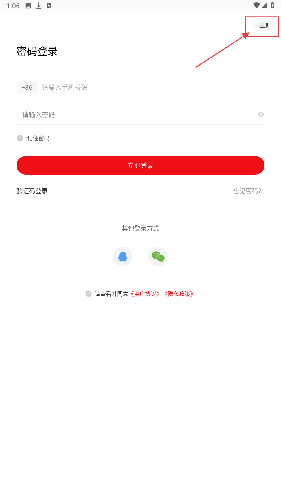 1、打开APP,进入登录页面,这里有【密码登录】和【验证码登录】两种方式,还有其他登录方式,如QQ、微信,点击【注册】。