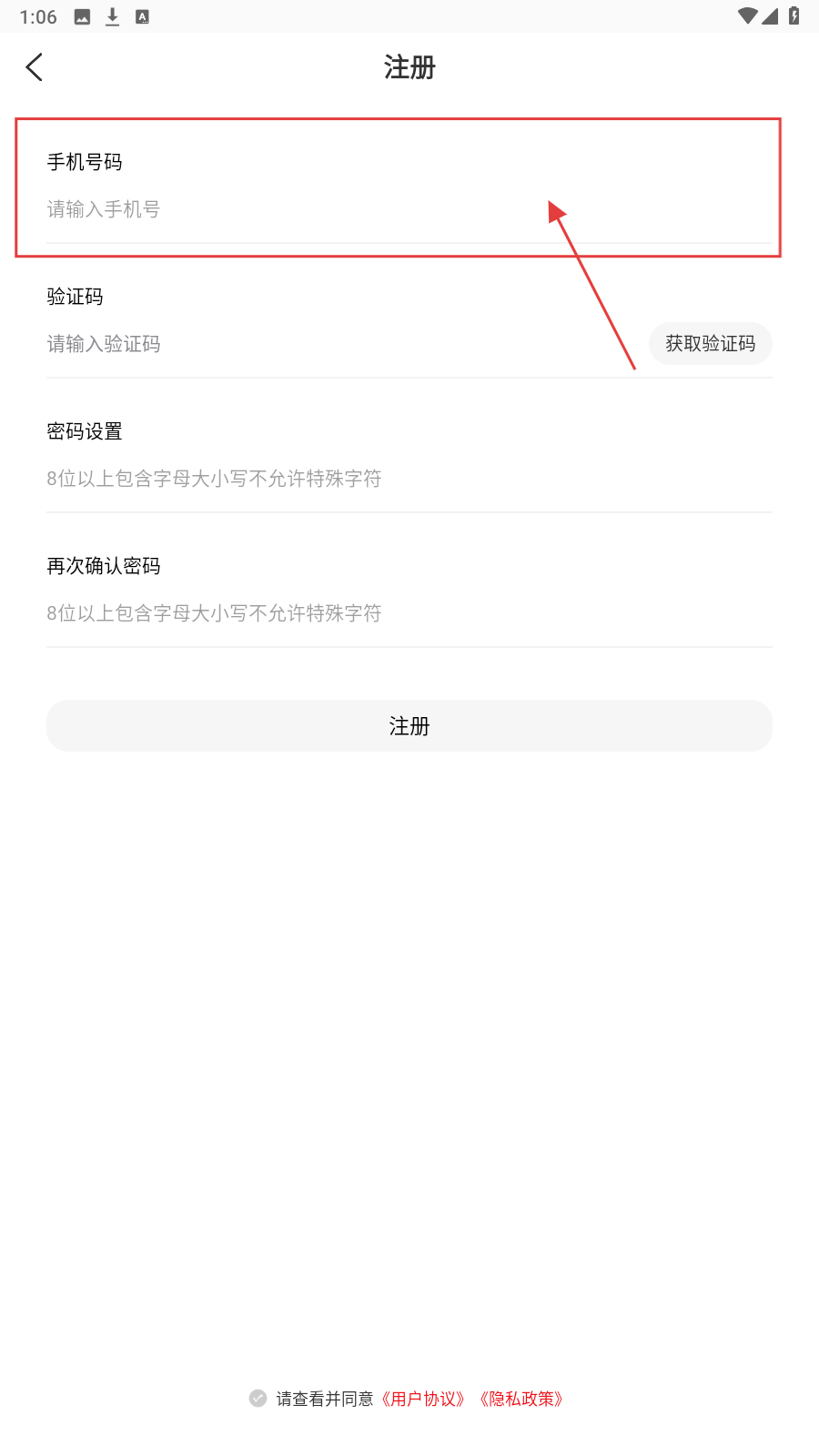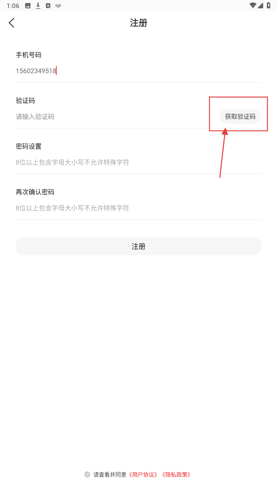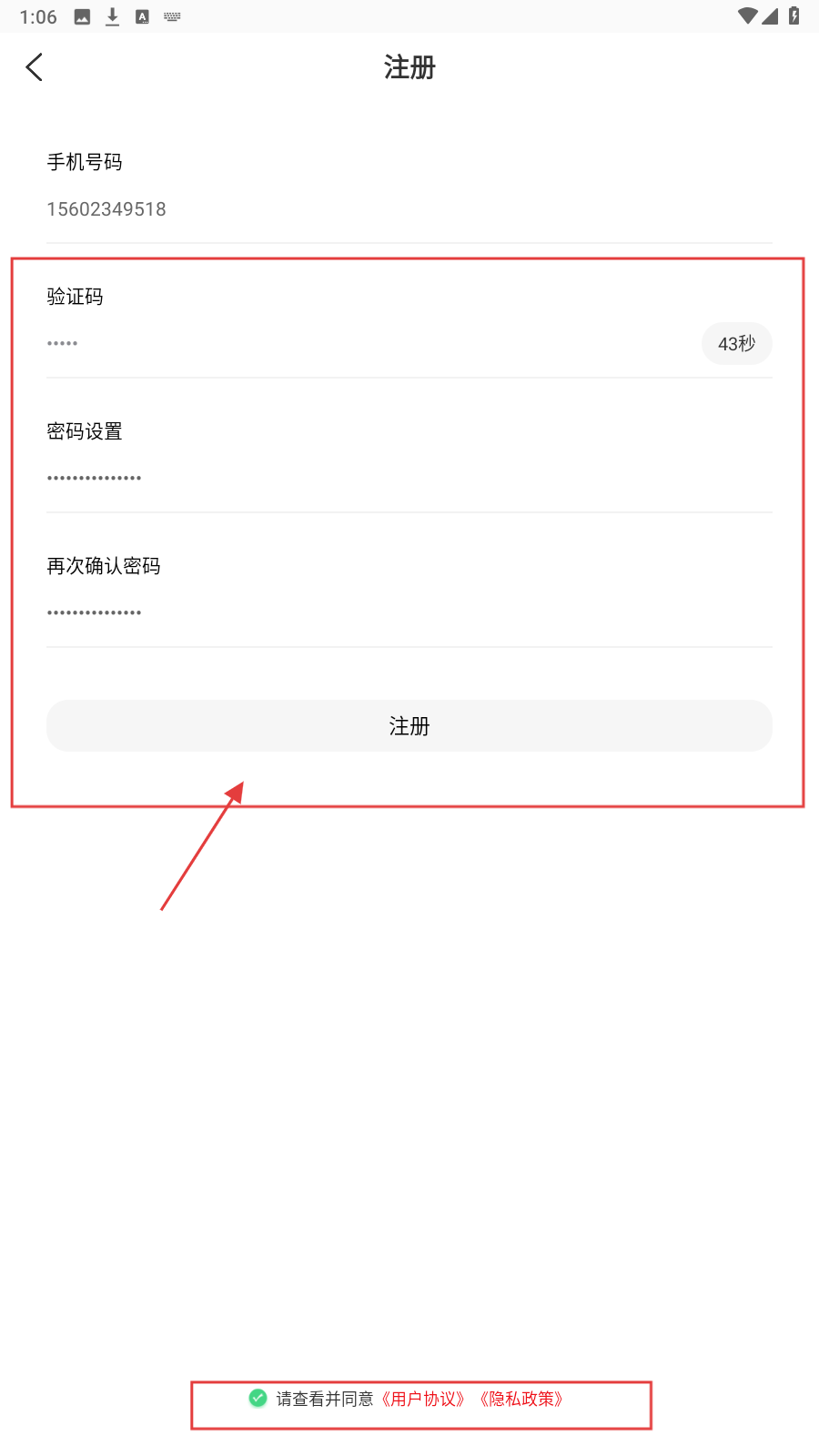 4、收到验证码后,在输入框中输入验证码,设置密码并再次确认密码,勾选协议,点击【注册】,即可完成注册。
