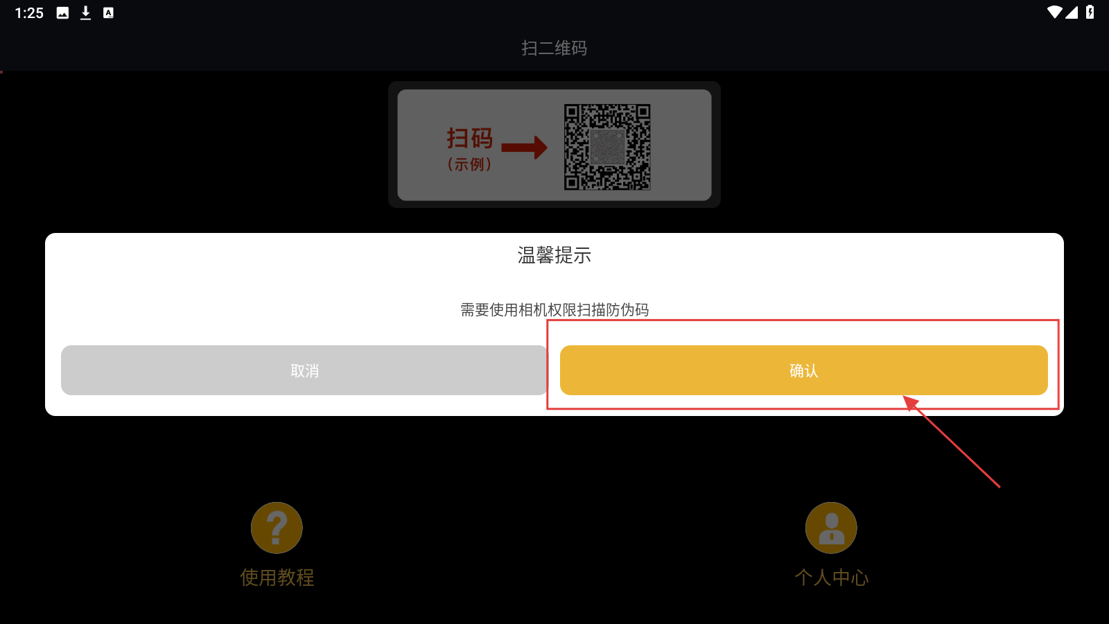 1、打开APP,弹出温馨提示框,提示需要使用相机权限扫描防伪码,点击【确认】。