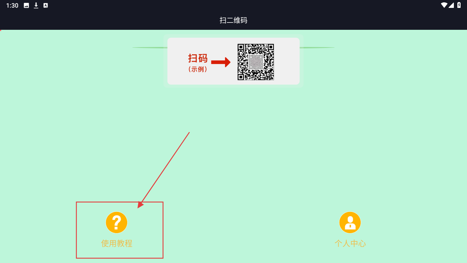 2、进入扫码页面,这里有扫码示例,可进行扫码操作,还有【使用教程】和【个人中心】两个功能选项。