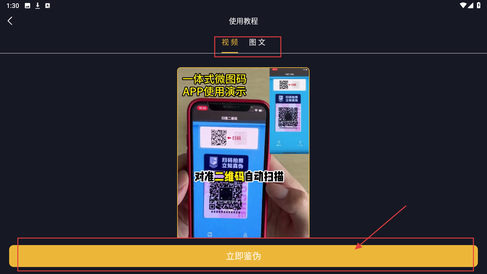 3、点击【使用教程】,进入使用教程页面,这里有【视频】和【图文】两种教程形式,点击【立即鉴伪】,可开始扫码鉴伪。