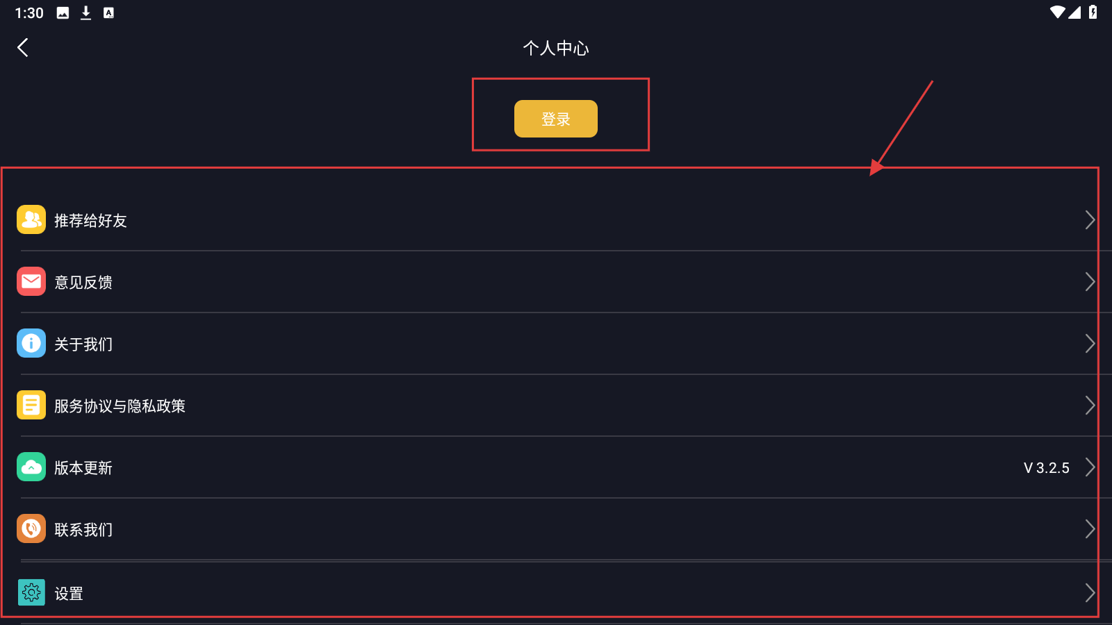 4、点击【个人中心】,进入个人中心页面,这里有【推荐给好友】【意见反馈】等个人功能选项,可进行登录、查看版本更新等操作。