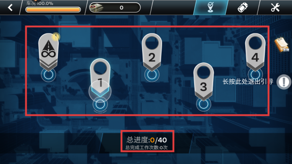 1、在关卡选择界面,点击如【关卡1】等关卡图标开启游戏,留意总进度(0/40)和总完成工作次数。