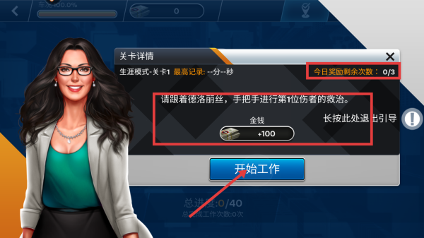 2、查看关卡详情,了解任务目标,如跟着德洛丽丝救治第1位伤者,完成可获金钱奖励(+100),注意今日奖励剩余次数(0/3)。