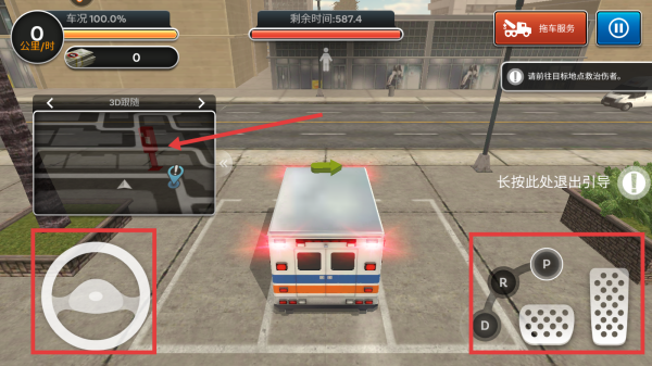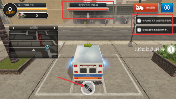 3、进入游戏后,按提示先点击安全带图标系好安全带,再驾驶救护车前往目标地点救治伤者。