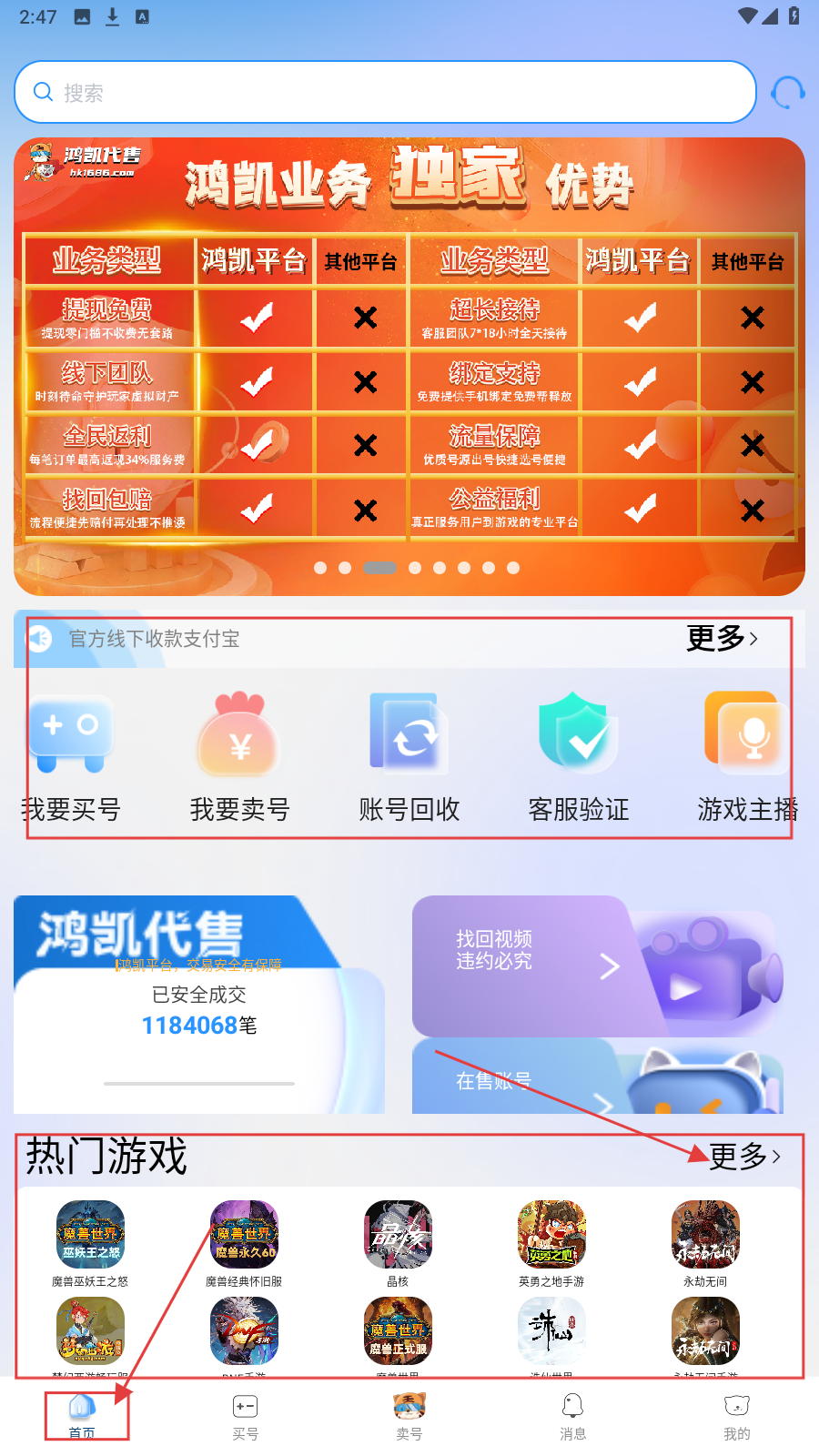 1、打开APP进入首页,有搜索栏、【我要买号】【我要卖号】等功能按钮及【热门游戏】展示区,方便了解平台和初步操作。
