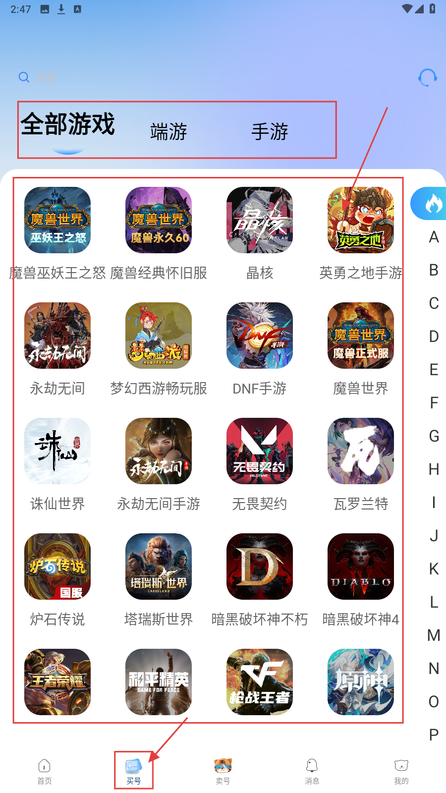2、点击底部【买号】,页面按【全部游戏】【端游】【手游】分类,可选择目标游戏。