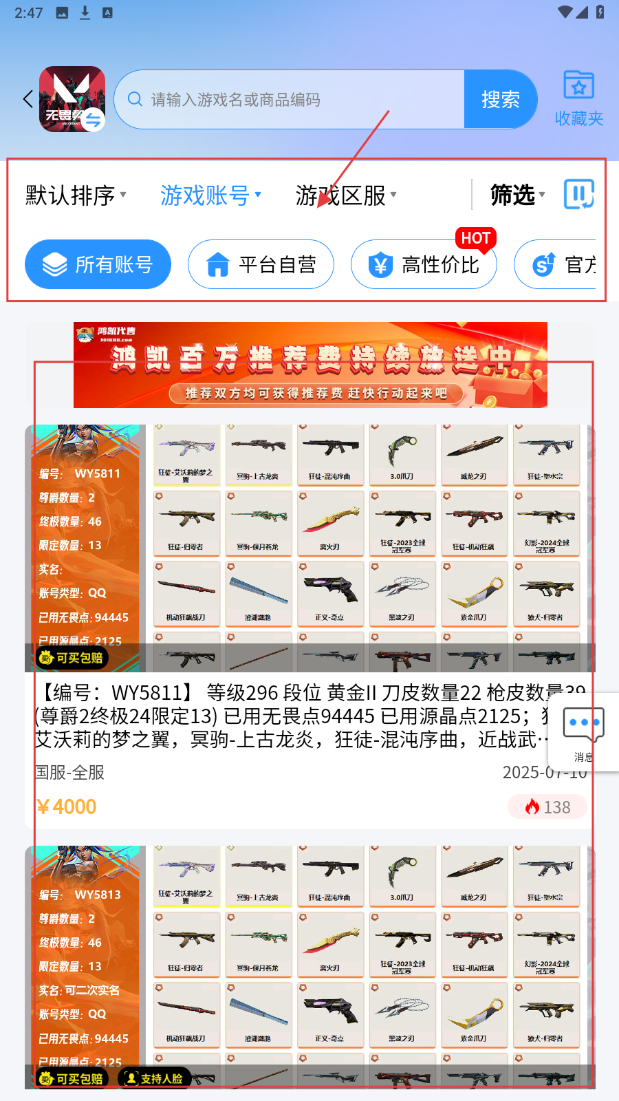 3、进入账号列表页,有搜索栏和【默认排序】【游戏区服】等筛选选项,列表展示账号基础信息供参考。