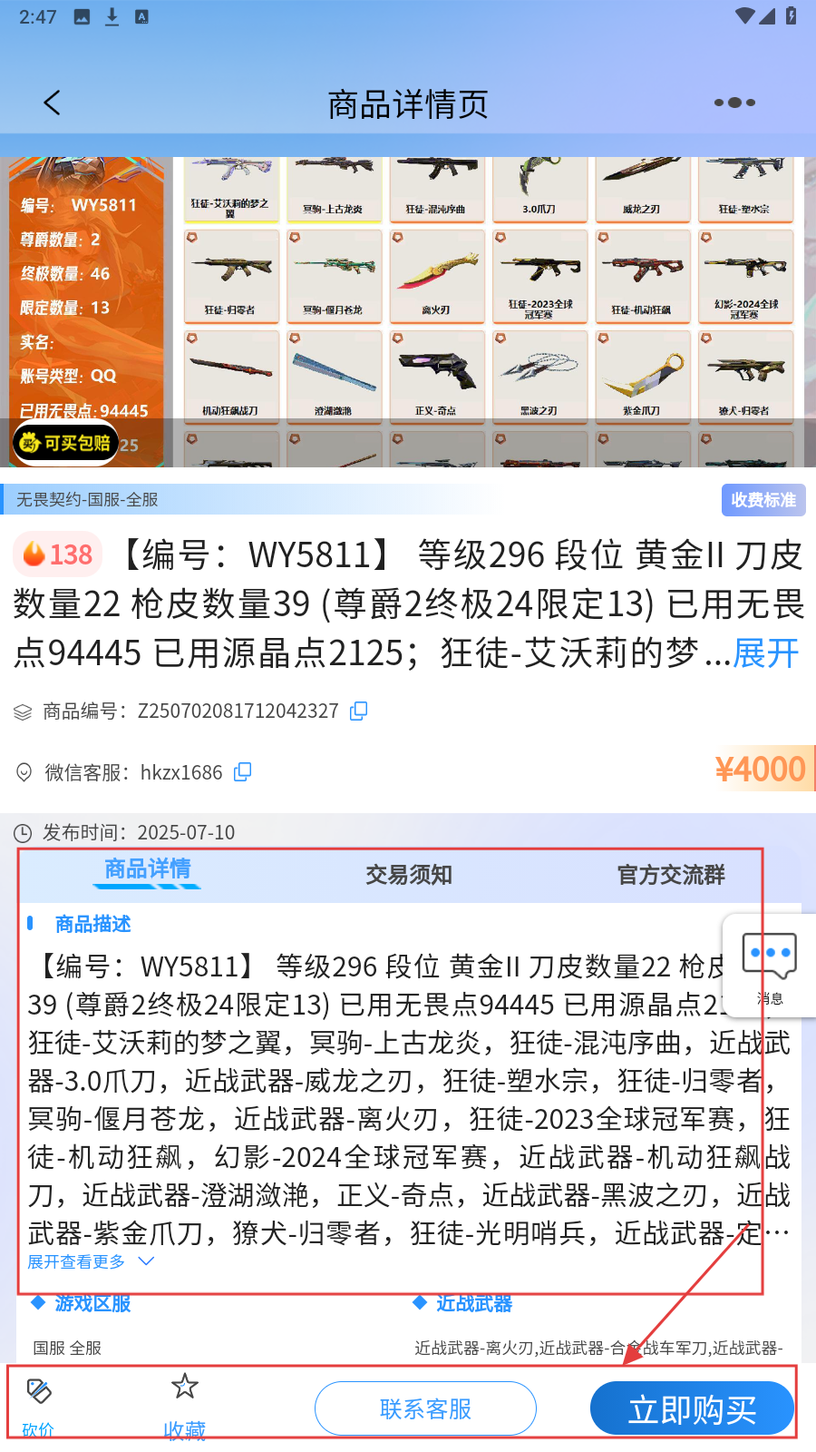 4、点击账号进入详情页,能查看详细信息和【交易须知】,可【联系客服】【砍价】【收藏】,确认后点击【立即购买】即可。