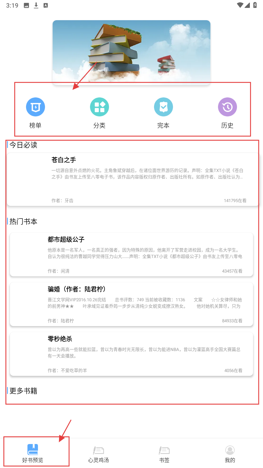 1、打开APP,进入【好书预览】页面,这里有【榜单】【分类】等功能按钮,还有【今日必读】【热门书本】等板块,可浏览推荐小说。