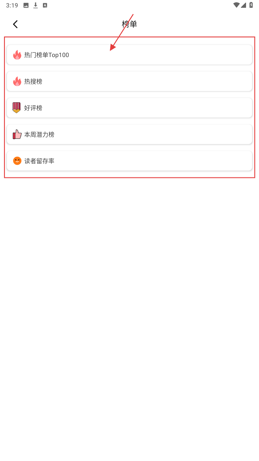 2、点击【榜单】,进入榜单页面,这里有【热门榜单Top100】【热搜榜】等榜单选项,可查看不同类型的小说榜单。