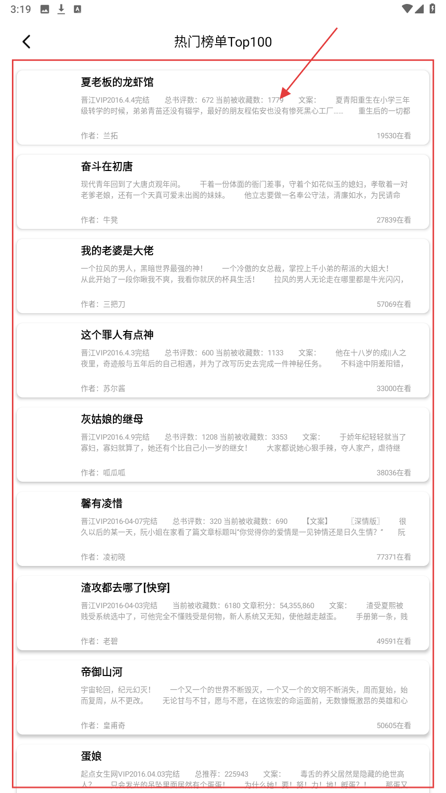 3、选择榜单后,进入榜单详情页面,这里有小说列表,可查看小说的名称、作者、简介、在看人数等信息,点击小说,进入小说详情页面。